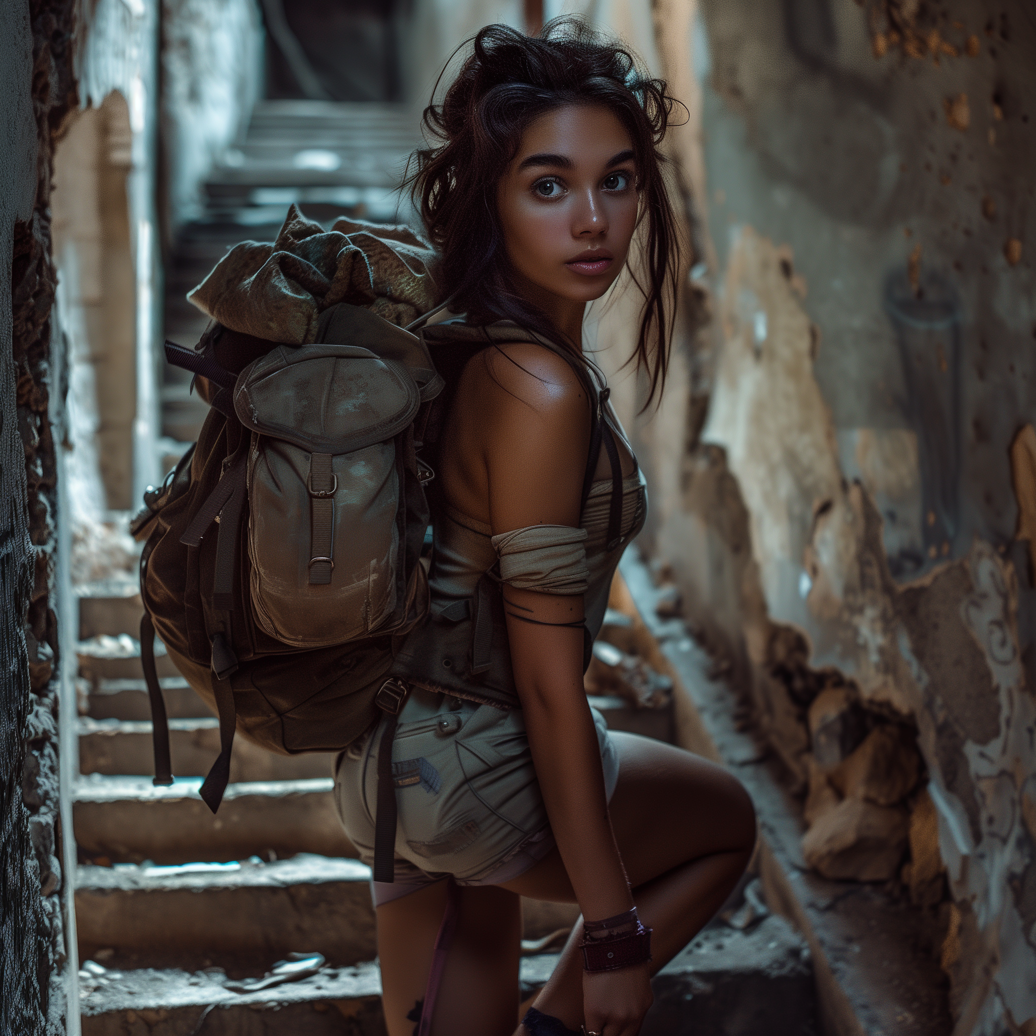 Chaotic, debris-filled setting with shattered glass and structural damage, reflecting the devastation and eerie stillness left in the wake of a hurricane.